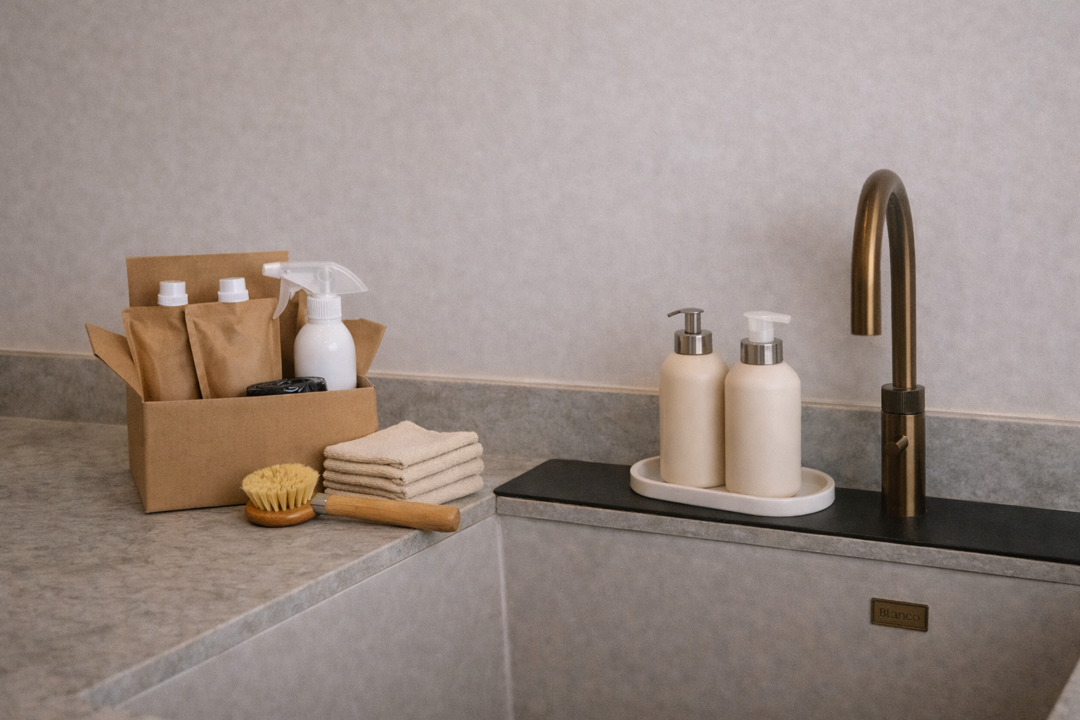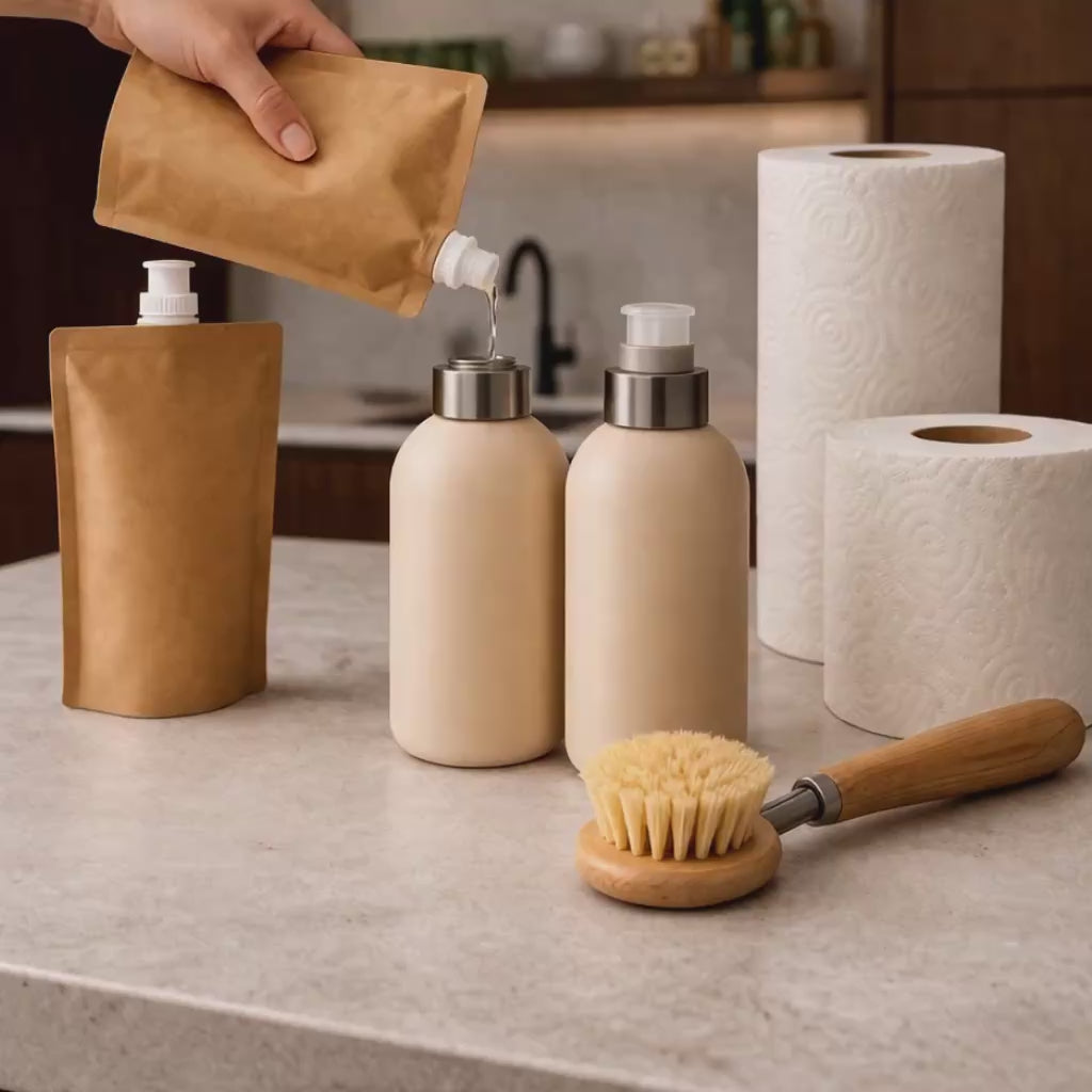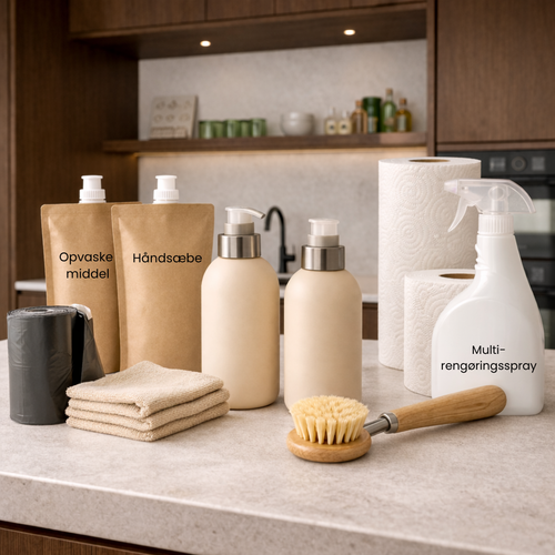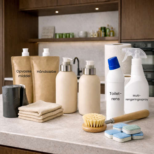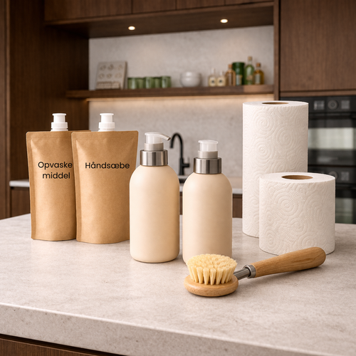 Vi sørger for månedlig levering af toiletpapir, køkkenrulle, opvaskemiddel, håndsæbe, opvaskebørste, affaldsposer, multirengøringsspray og karklude